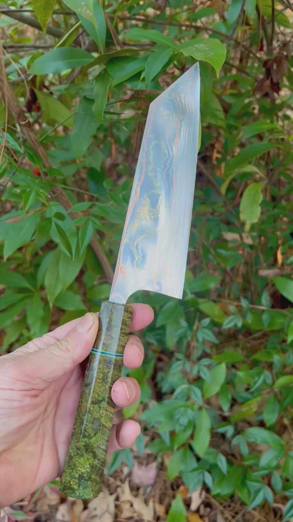 This limited edition Rainbow Damascus line is forged with an Aogami steel core and wrapped in a damascus made from stainless, copper, and brass, giving it the wonderful "rainbow" coloring.