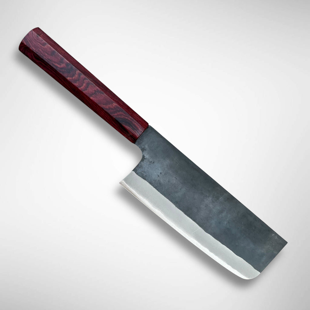 This line of chef knives features a nimble Aogami (blue) Super core with a stainless hammered blacksmith finish. The design is clean and simple with the excellence that can be expected from this master blacksmith.